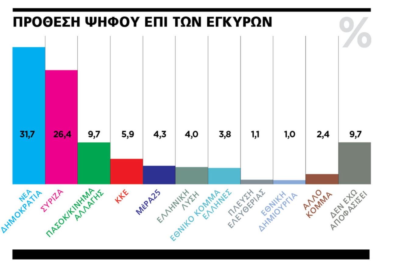 Η έρευνα δείχνει να ανοίγει εκ νέου η ψαλίδα της διαφοράς που χωρίζει τα δύο μεγαλύτερα κόμματα στην πρόθεση ψήφου, καθώς διαμορφώνεται σε 5,2% από 4,6% που ήταν στην αμέσως προηγούμενη έρευνα. Η Ν.Δ. ανακτά 1,3 από τις 2,9 εκατοστιαίες μονάδες τις οποίες έχασε μετά τα Τέμπη και βρίσκεται πλέον στο 30,9%, ποσοστό που με αναγωγή επί των εγκύρων ανεβαίνει στο 31,7%. Ο ΣΥΡΙΖΑ ακολουθεί με 25,7% (+0,7%) στην πρόθεση ψήφου, που γίνεται 26,4% με την αναγωγή και αποτελεί την καλύτερη έως τώρα επίδοση της Κουμουνδούρου από τον Δεκέμβριο του 2021. Την ίδια ώρα το ΠΑΣΟΚ μοιάζει κολλημένο στην περιοχή του 9,5%, ενώ ενισχυμένα περισσότερο ή λιγότερο είναι τα μικρότερα κόμματα, ήτοι το ΚΚΕ, το ΜεΡα25 και η Ελληνική Λύση. Καθαρά εντός Βουλής εμφανίζεται και το κόμμα Έλληνες του Ηλία Κασιδιάρη, αν και απομένει η κρίση του Αρείου Πάγου.