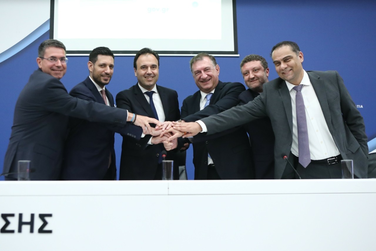 Στην τελετή παράδοσης – παραλαβής στο υπουργείο Ψηφιακής Διακυβέρνησης ο υπουργός Δημήτρης Παπαστεργίου και ο υφυπουργός Κωνσταντίνος Κυρανάκης παρέλαβαν τη σκυτάλη από τον Σωκράτη Κάτσικα.