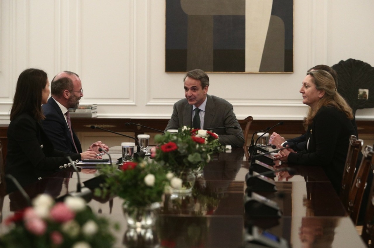Ο πρωθυπουργός Κυριάκος Μητσοτάκης συναντήθηκε στο Μέγαρο Μαξίμου με τον Πρόεδρο του Ευρωπαϊκού Λαϊκού Κόμματος και επικεφαλής της Κοινοβουλευτικής Ομάδας του ΕΛΚ στο Ευρωπαϊκό Κοινοβούλιο Mάνφρεντ Βέμπερ, ο οποίος βρίσκεται στην Ελλάδα προκειμένου να συμμετάσχει σε εκδήλωση που συνδιοργανώνουν η Νέα Δημοκρατία και το Ευρωπαϊκό Λαϊκό Κόμμα.