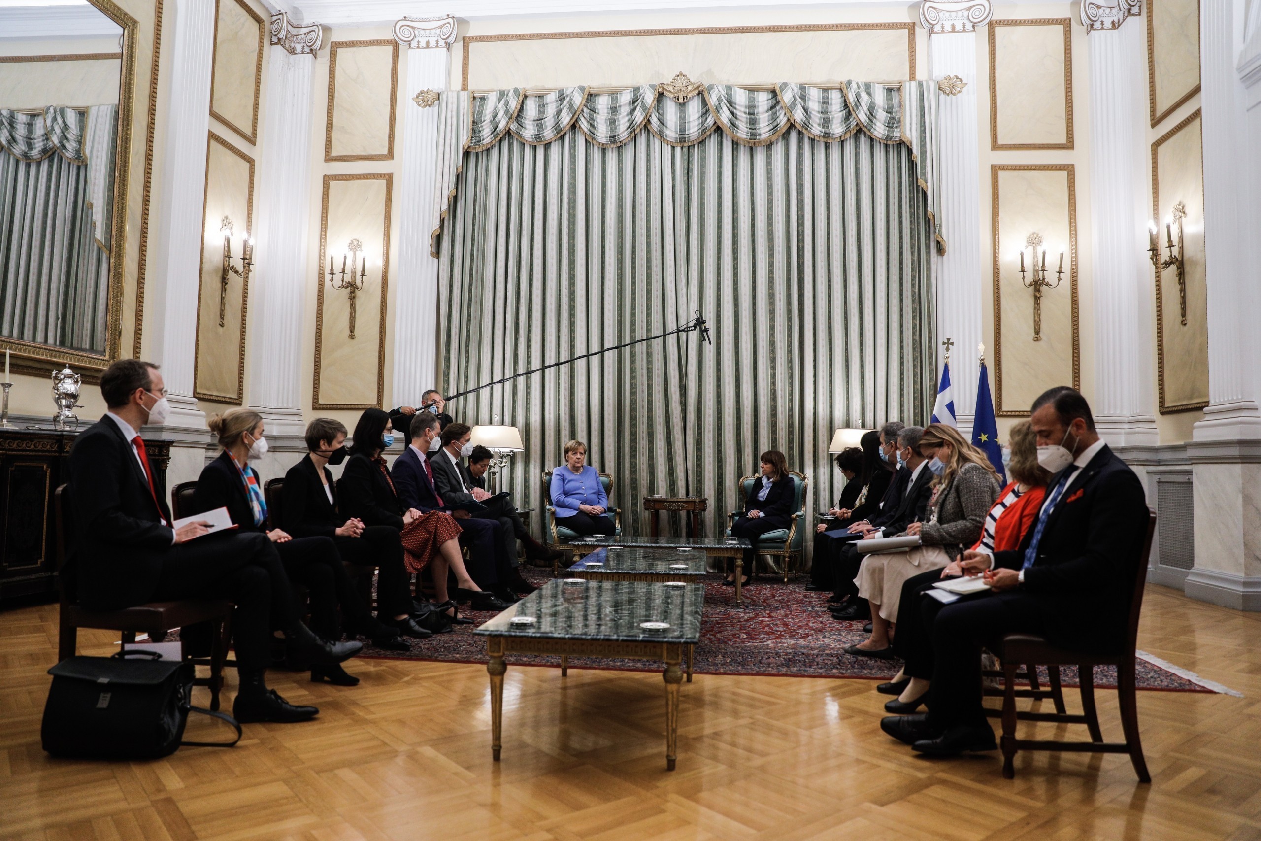 Στο Προεδρικό Μέγαρο την υποδέχτηκε η Πρόεδρος της Δημοκρατίας Κατερίνα Σακελλαροπούλου λίγο μετά τις 10:00. «Υποδέχομαι μια σπουδαία πολιτικό που διαμόρφωσε σχεδόν για δυο δεκαετίες την πολιτική της Γερμανίας και της Ευρώπης», είπε η Πρόεδρος της Δημοκρατίας καλωσορίζοντας την Γερμανίδα καγκελάριο στο Προεδρικό Μέγαρο.