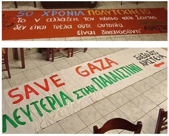 Όπως φαίνεται στα δύο από τα πανό που θα κρατούν όσοι βρεθούν στο συγκεκριμένο μπλοκ, το ένα θα αφορά τα 50 χρόνια της επετείου της εξέγερσης του Πολυτεχνείου και το δεύτερο την κατάσταση στην Παλαιστίνη.