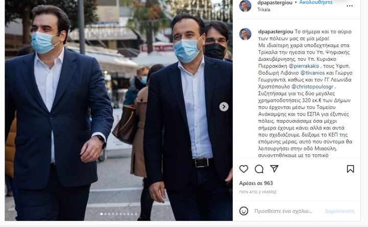 Με ιδιαίτερη χαρά υποδεχτήκαμε στα Τρίκαλα την ηγεσία του Υπ. Ψηφιακής Διακυβέρνησης, τον Υπ. Κυριάκο Πιερρακάκη @pierrakakis , τους Υφυπ. Θοδωρή Λιβάνιο @tlivanios και Γιώργο Γεωργαντά, καθώς και τον ΓΓ Λεωνίδα Χριστόπουλο @christopoulosgr . Συζητήσαμε για τις δύο μεγάλες χρηματοδοτήσεις 320 εκ.€ των Δήμων που έρχονται μέσω του Ταμείου Ανάκαμψης και του ΕΣΠΑ για έξυπνες πόλεις, παρουσιάσαμε όσα μέχρι σήμερα έχουμε κάνει αλλά και αυτά που σχεδιάζουμε, δείξαμε το ΚΕΠ της επόμενης μέρας, αυτό που σύντομα θα λειτουργήσει στην οδό Μιαούλη, συναντηθήκαμε με το τοπικό οικοσύστημα της πληροφορικής, πήγαμε στην λαϊκή και είδαμε πώς η τεχνολογία μπορεί φανεί χρήσιμη σε κάθε λειτουργία της πόλης, κινηθήκαμε με τα δύο νέα υπό δοκιμή ηλεκτρικά λεωφορεία, είδαμε τη νέα ασφαλή διάβαση πεζών στην οδό Στρ. Σαράφη, μιλήσαμε για το νέο σύστημα κοινόχρηστων ηλεκτρικών ποδηλάτων.