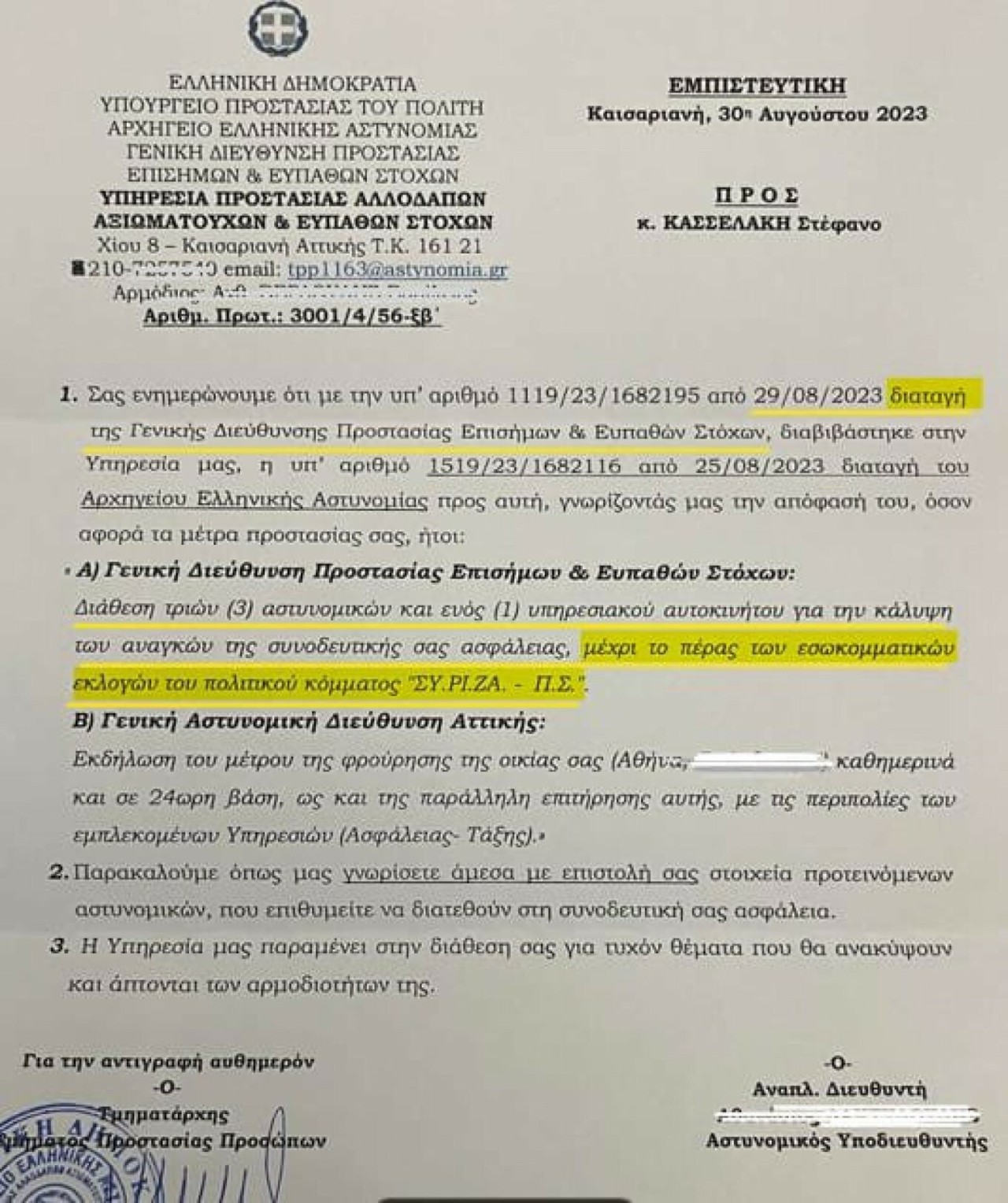 Το μεσημέρι της Παρασκευής (1/9), στο ΣΚΑΪ ο δημοσιογράφος Βασίλης Χιώτης, έκανε γνωστό ότι ο κ. Κασσελάκης έχει ζητήσει αστυνομική προστασία και το αίτημα για τη διάθεση των αστυνομικών έχει εγκριθεί.