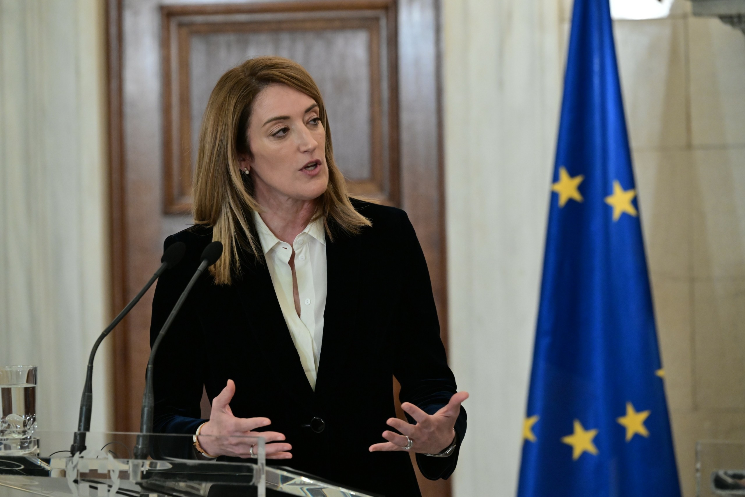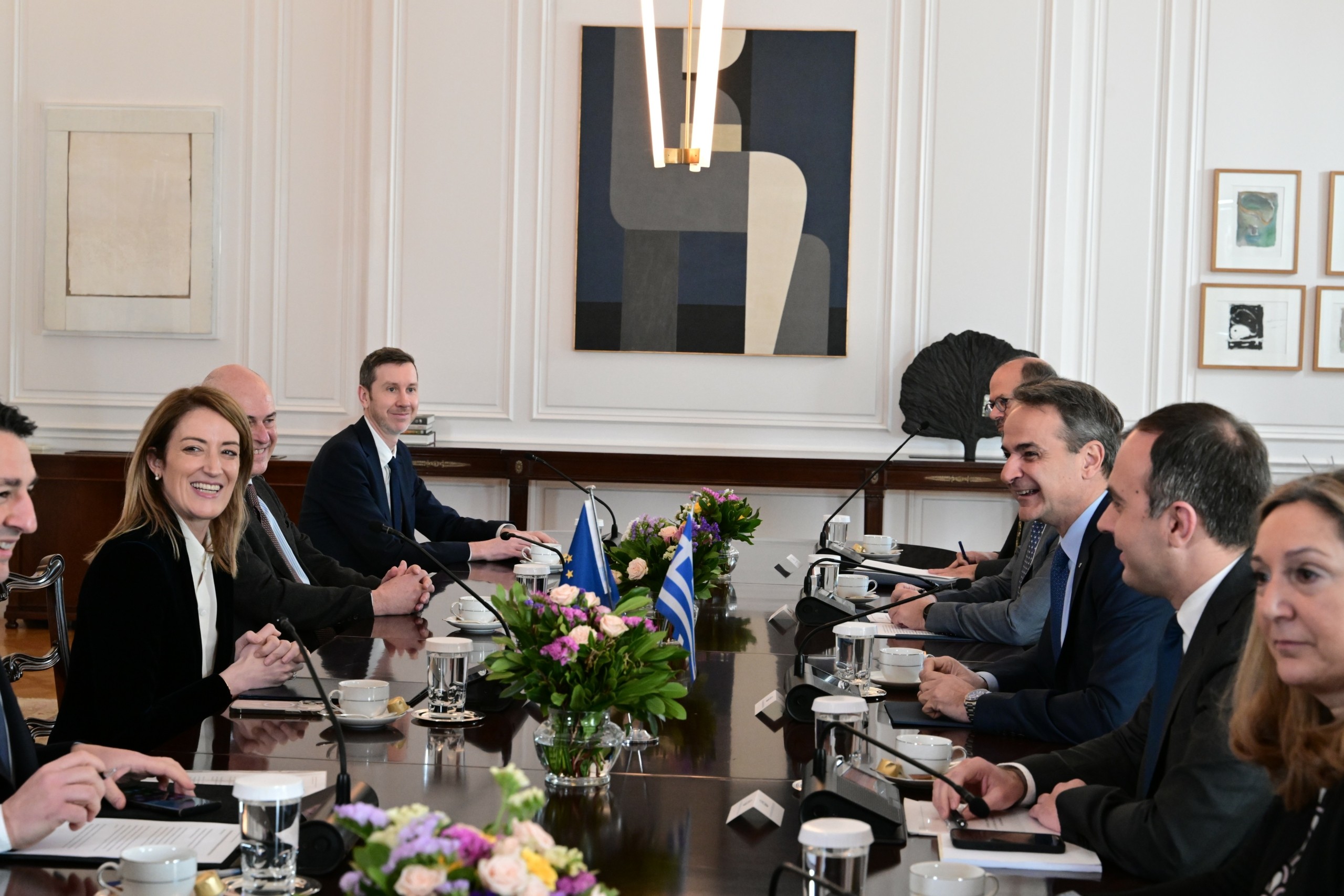 Κοινές δηλώσεις με την πρόεδρο του Ευρωπαϊκού Κοινοβουλίου Ρομπέρτα Μέτσολα, στο Μέγαρο Μαξίμου πραγματοποίησε νωρίτερα ο πρωθυπουργός Κυριάκος Μητσοτάκης.