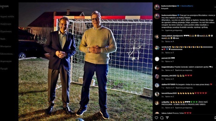 Ο Βούτσιτς ανήρτησε στο Instagram φωτογραφία μαζί με τον Έλληνα πρωθυπουργό μπροστά από μία εστία ποδοσφαίρου όπου έγραψε: «Αυτήν την εστία πίσω από τον πρωθυπουργό Μητσοτάκη και εμένα την αγόρασε ο πατέρας μου για τον μικρό Βούκαν (σ.σ. Ο εξάχρονος γιος του Αλ. Βούτσιτς). Ο Κυριάκος και εγώ απλά βγήκαμε φωτογραφία με την μπάλα. Χαίρομαι που μπορώ να φιλοξενήσω έναν μεγάλο φίλο της Σερβίας, είμαι περήφανος για την προσωπική μας σχέση, πιστεύω ότι θα επιτύχουμε σπουδαία αποτελέσματα στη βελτίωση της συνεργασίας μεταξύ των αδελφών λαών, του σερβικού και του ελληνικού».