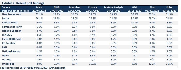 Σύμφωνα με την AXIA, εφόσον η Ν.Δ. πετύχει ποσοστά της τάξης του 35% – 36% στις εκλογές της 21ης Μαΐου, τότε είναι πολύ πιθανό να επιδιώξει μια δεύτερη εκλογική αναμέτρηση, παρά να εμπλακεί σε διαπραγματεύσεις συνεργασίας με το ΠΑΣΟΚ.