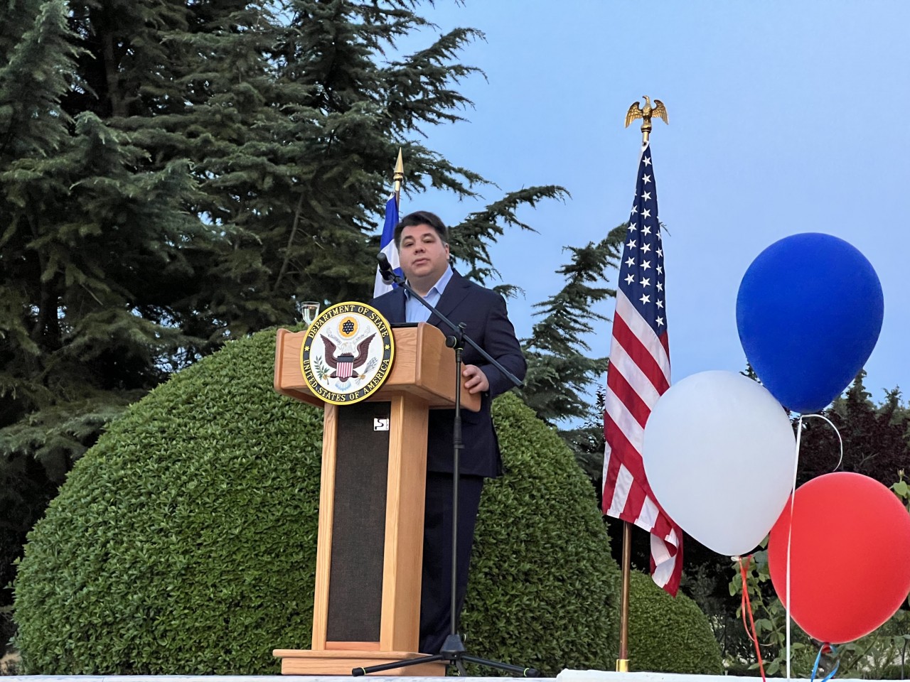 «Σήμερα, γιορτάζουμε τη “Διακήρυξη της Ανεξαρτησίας” των Ηνωμένων Πολιτειών της Αμερικής. Γιορτάζουμε την αναζήτηση ενός έθνους και μιας διαφορετικής ομάδας ανθρώπων -που αντιπροσωπεύουν όλα τα κοινωνικά στρώματα, κάθε σεξουαλικό προσανατολισμό, πεποιθήσεις ή θρησκευτικά πιστεύω- οι οποίοι ενώθηκαν πριν από 246 χρόνια και παραμένουν ενωμένοι από ένα κοινό όνειρο για την ισότητα και το “κυνήγι” της ζωής, της ελευθερίας και της ευτυχίας για όλους», τόνισε ο Αμερικανός πρέσβης, επισημαίνοντας πως «αυτό το όνειρο της δημοκρατίας γεννήθηκε εδώ στην Ελλάδα».