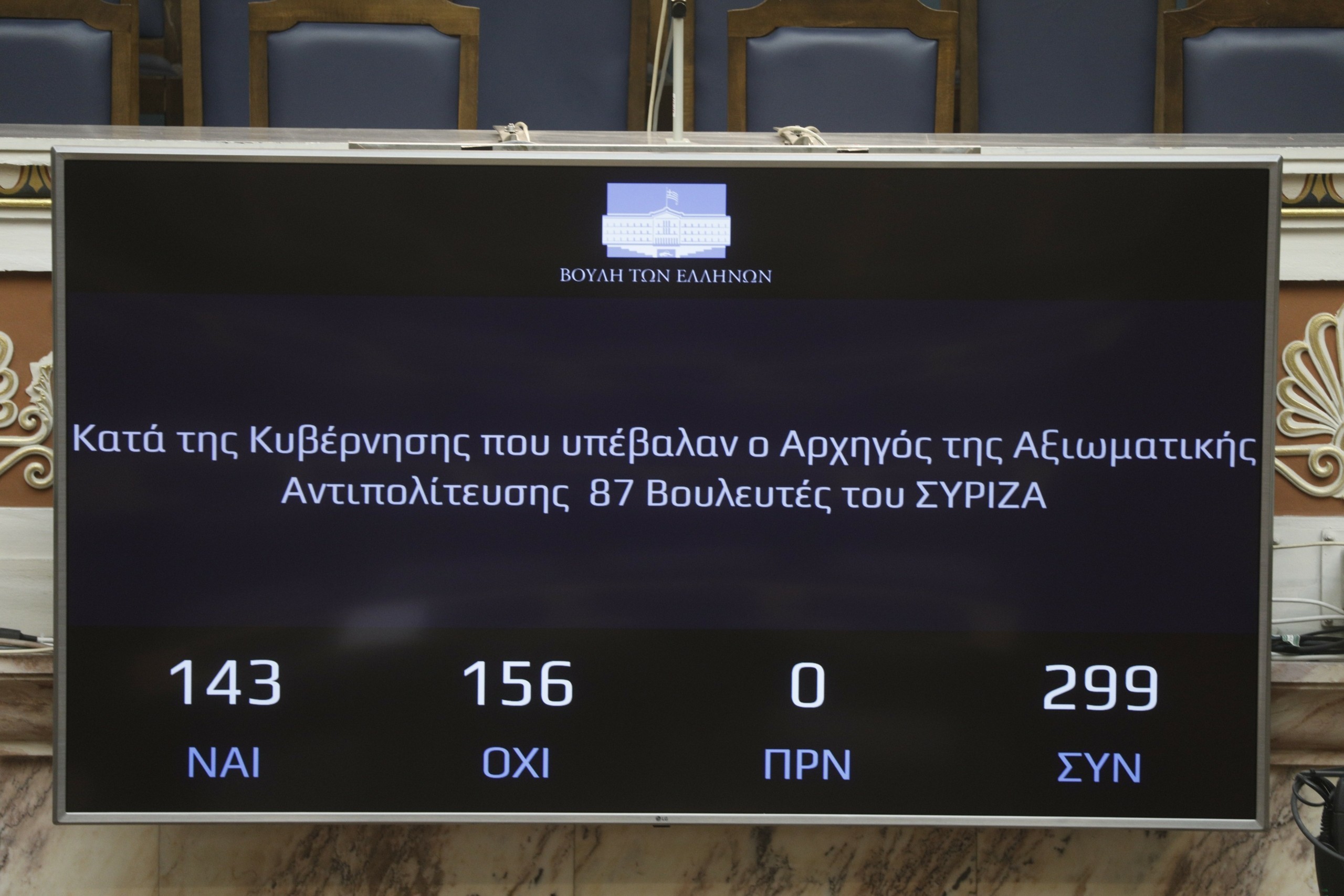 Κατά την ονομαστική φανερή ψηφοφορία, συνολικά ψήφισαν 299 βουλευτές. Υπέρ της πρότασης ψήφισαν 143 βουλευτές και κατά 156. Παρών δεν ψήφισε κανένας βουλευτής. Η ψηφοφορία πραγματοποιήθηκε με ηλεκτρονικό σύστημα, ενώ το αποτέλεσμα ανακοίνωσε ο Β’ αντιπρόεδρος της Βουλής Χαράλαμπος Αθανασίου. Απουσίαζε ο ανεξάρτητος βουλευτής Γρεβενών Ανδρέας Πάτσης.