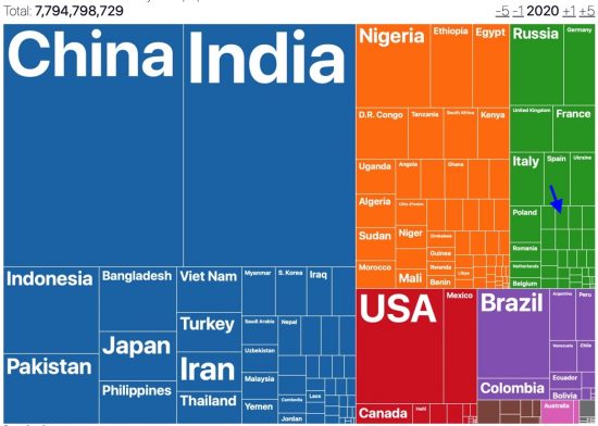 Στο διάγραμμα δεσπόζουν οι πιο πολυάνθρωπες χώρες του κόσμου, η Κίνα και η Ινδία. Η Ευρώπη, με το πράσινο χρώμα εμφανίζεται δεξιά. Η Ελλάδα είναι το τετράγωνο με το μπλε βέλος. Συναφείς πληθυσμιακά χώρες, τα γειτονικά τετράγωνα με ίδιο περίπου εμβαδό είναι η Σουηδία, η Πορτογαλία, η Τσεχία, η Αυστρία, η Ουγγαρία, η Σερβία και η Λευκορωσία – έκαστη με περίπου 10 εκατομμύρια πληθυσμό.