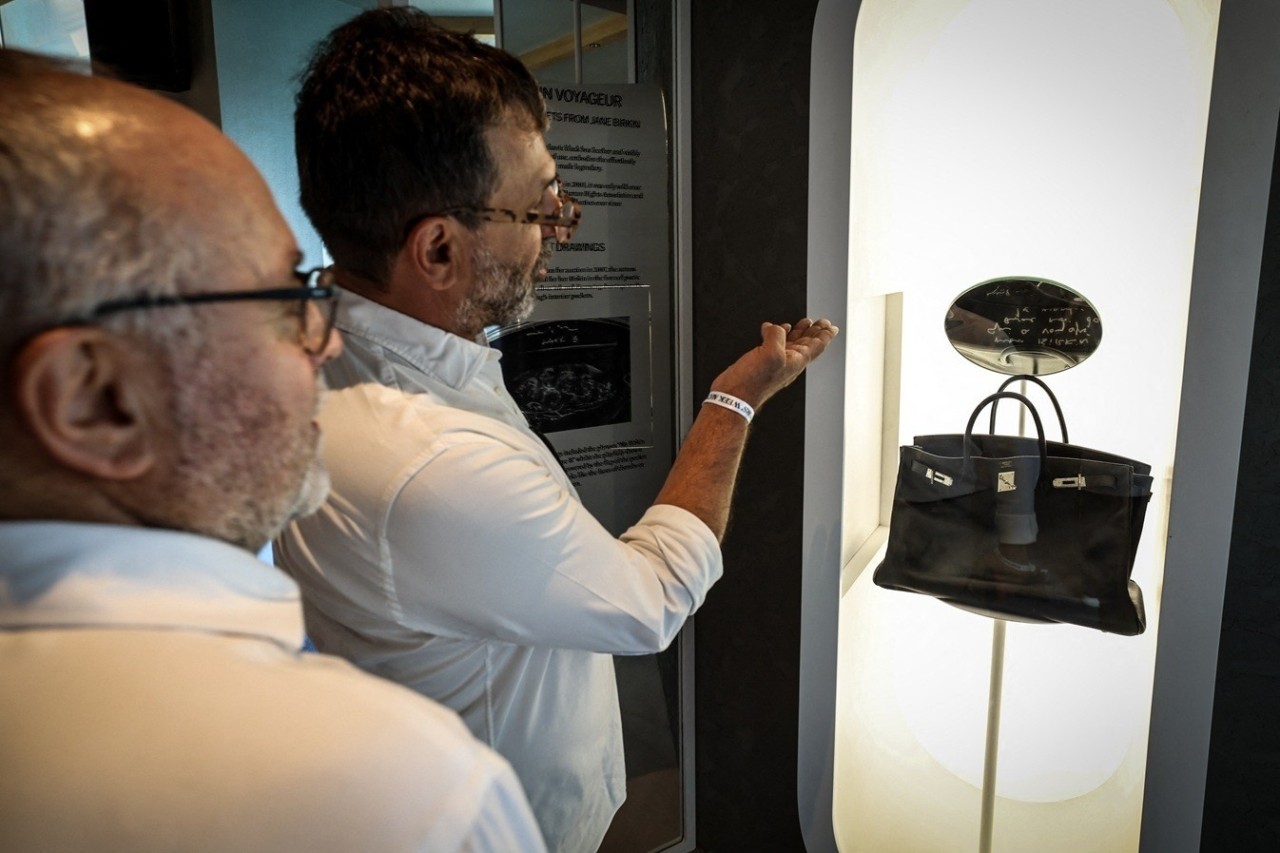Αυτή η μαύρη δερμάτινη τσάντα, την οποία προσέφερε ο Hermès στην Τζέιν Μπίρκιν το 2003, είναι μεταχειρισμένη και διακοσμημένη με χειρόγραφες επιγραφές της Βρετανίδας τραγουδίστριας και ηθοποιού, που πέθανε το 2023. Είναι μεταξύ τεσσάρων τσαντών που η καλλιτέχνης έλαβε αφού πούλησε το εμβληματικό πρωτότυπό της το 1994 στο πλαίσιο μιας φιλανθρωπικής δράσης υπέρ μιας οργάνωσης κατά του AIDS.