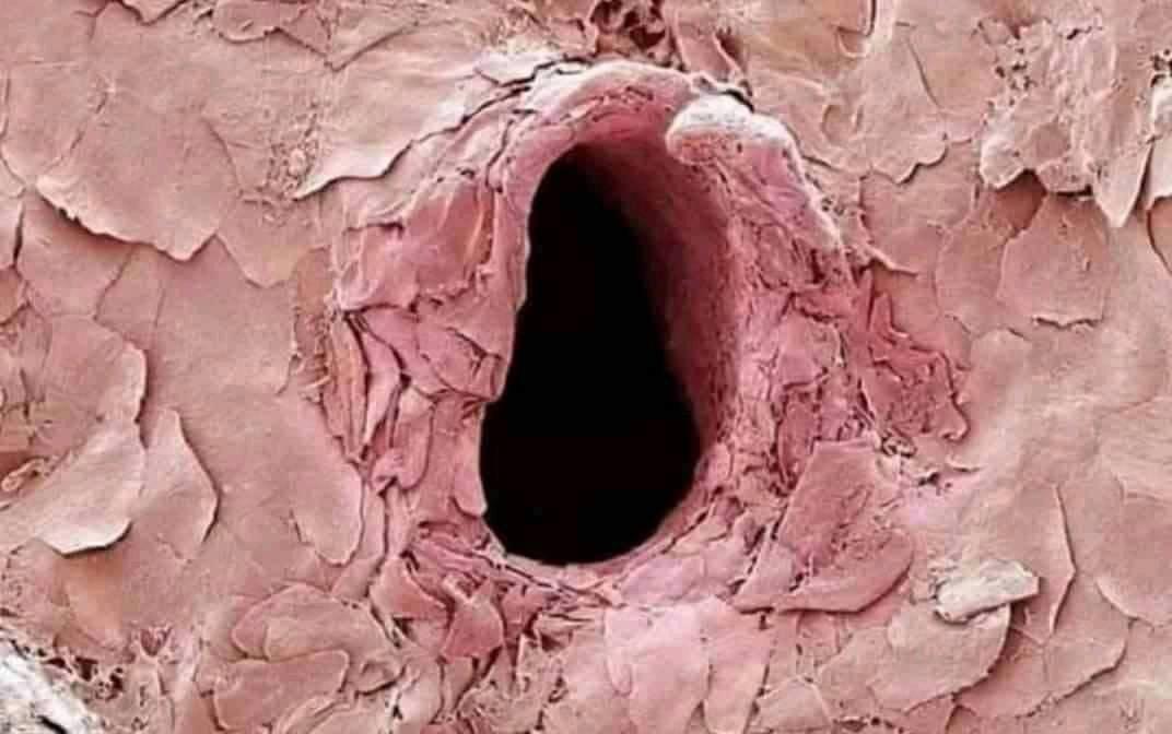 Ποιος θα μπορούσε να φανταστεί ότι αυτή η εικόνα αναπαριστά την τρύπα που αφήνει μια βελόνα / σύριγγα στο δέρμα μας, όπως φαίνεται από ένα ηλεκτρονικό μικροσκόπιο;