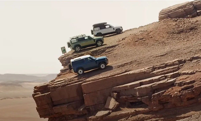 Κάπου εκεί σταμάτησαν τόσο τα Land Rover, όσο και οι προβολές του διαφημιστικού σποτ καθώς τα Defender σταμάτησαν μετά ηχητική προειδοποίηση των αισθητήρων παρκαρίσματος.