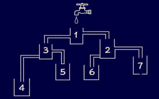 Η απάντηση είναι το νούμερο 3 και όχι το 5 ή το 4 που απαντούν οι περισσότεροι καθώς οι σωλήνες προς τα εκεί είναι κλειστές. Επιπλέον το ποτήρι νούμερο 7 έχει τρύπα οπότε θα αδειάζει συνεχώς μαζί με το 2 που θα γεμίζει ως τη μέση ενώ το 6 επίσης έχει κλειστό σωλήνα.