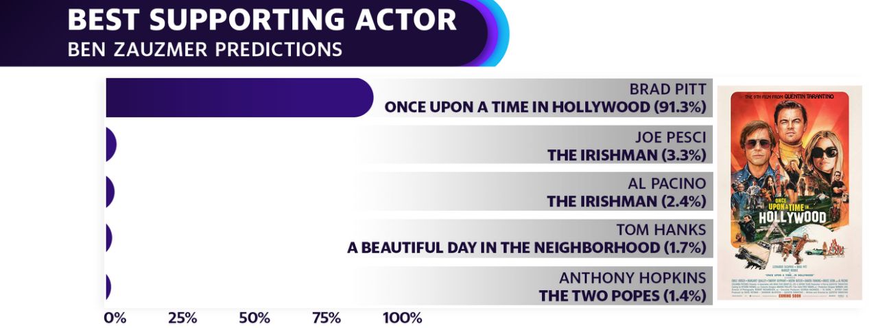 Και εδώ το μαθηματικό μοντέλο δίνει ξεκάθαρο φαβορί. Η νίκη μοιάζει εύκολη για τον Μπραντ Πιτ ο οποίος παρά το γεγονός ότι ήταν υποψήφιος τρεις φορές δεν έχει ποτέ κερδίσει Όσκαρ. Τώρα έχει 91% πιθανότητες να κερδίσει για το ρόλο στον οποίο ενσαρκώνει ένα κασκαντέρ