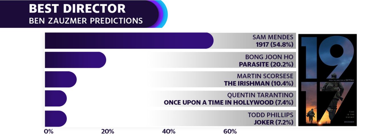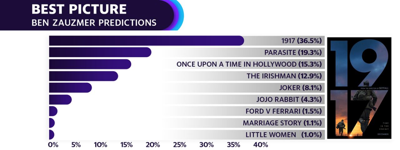 Φαινομενικά η πιο δύσκολη κατηγορία για να προβλεφτεί φέτος, όπως και στο παρελθόν, είναι το Όσκαρ για την Καλύτερη Ταινία. Περισσότερες πιθανότητες – 37% – συγκεντρώνει το 1917. Αλλά, όπως σημειώνει ο Ζάουζμερ, αυτή δεν είναι ασφαλής πρόβλεψη. Το ότι σάρωσε ωστόσο σε άλλες φετινές διοργανώσεις, την κάνει φαβορί.