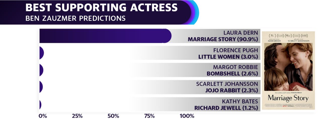 Οι ίδιες αποδόσεις ισχύουν και για το αγαπημένο στην κατηγορία Best Supporting Actress. Για τον υποστηρικτικό ρόλο της στην “Ιστορία ενός Γάμου”, η ηθοποιός Λώρα Ντεν έχει περισσότερες από 90% πιθανότητες να κερδίσει το Όσκαρ για την κατηγορία.
