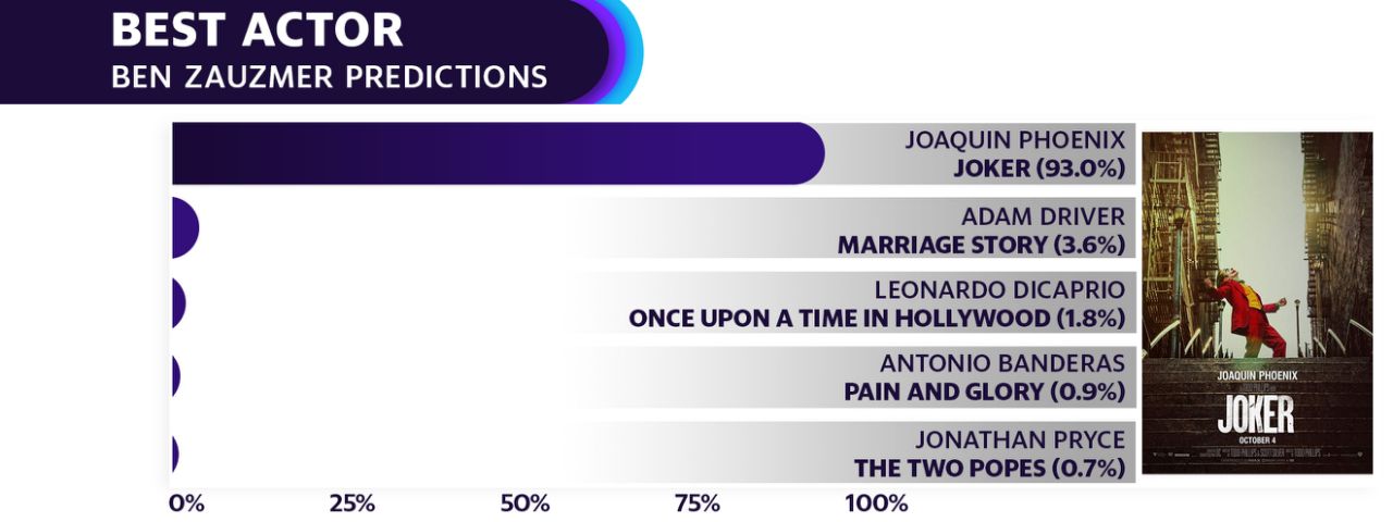 Ο πρωταγωνιστής “Joker” Χόακιν Φίνιξ έχει οριστεί για Όσκαρ τρεις φορές σε προηγούμενα χρόνια, αλλά ποτέ δεν κέρδισε. Φέτος, ωστόσο, ο Ζάουζμερ προβλέπει ότι η Φοίνιξ έχει την καλύτερη ευκαιρία να κερδίσει με πιθανότητες περίπου 93%