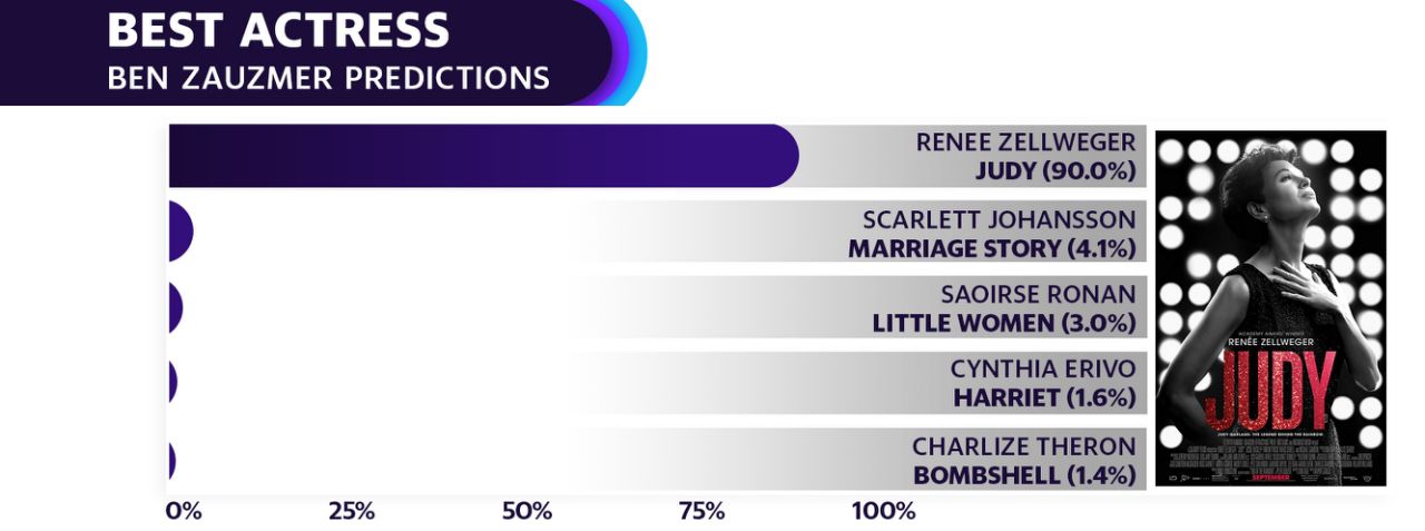 Τα πράγματα φαίνονται εξίσου ασφαλή για την πρωτοπόρο στη μάχη για την καλύτερη ηθοποιό. Στο μοντέλο του Zauzmer, η πρωταγωνίστρια του “Judy” Ρενέ Ζέλβεγκερ έχει περίπου 90% πιθανότητα να κερδίσει το Όσκαρ.