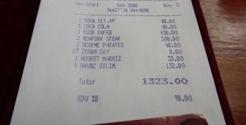 Στον λογαριασμό αναφέρεται ότι ένα New York Steak κόστισε 500 λίρες και τα αρνίσια παιδάκια στις 450. Ουσιαστικά τέσσερις μερίδες αντιστοιχούν στον κατώτατο μισθό της Τουρκίας το ακαθάριστο ύψος του οποίου είναι κάτω από τις 3.000 τουρκικές λίρες.