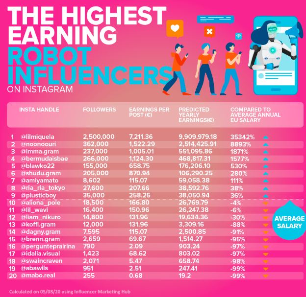 Η Lil Miquela είναι το ρομπότ που σαρώνει και προβλέπεται να κερδίσει σχεδόν 10 εκατομμύρια ευρώ φέτος! Η Cartoony noonoouri έρχεται δεύτερη με κέρδη 2,5 εκατομμύρια ευρώ μέχρι το τέλος του έτους. Η virtual αντίπαλος της Miquela, Βermuda, κατέχει την τέταρτη θέση – θα μπορούσε να κερδίσει πάνω από 551.000 ευρώ το 2020.