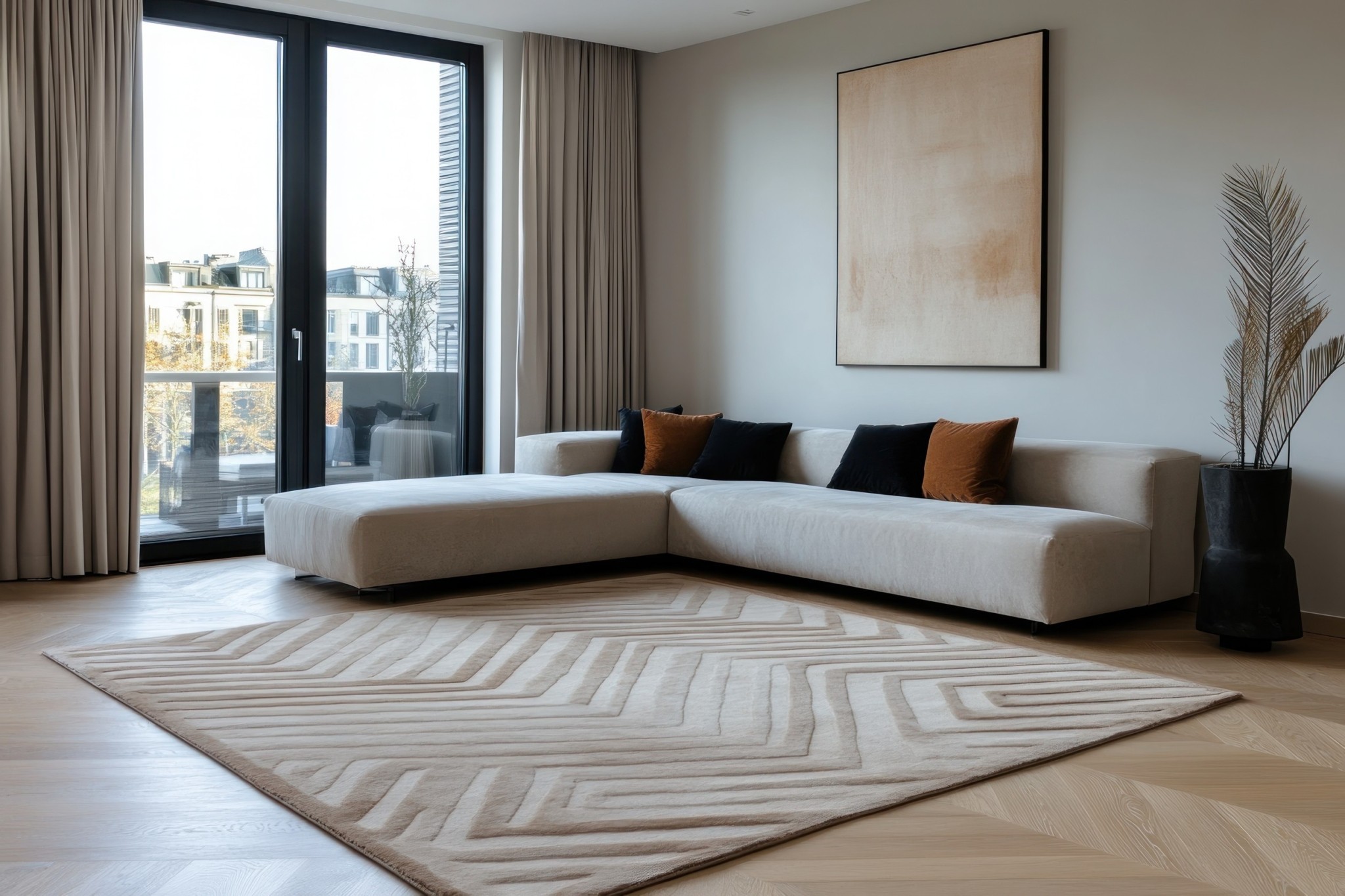 Αν δεν θέλετε να καλύψετε όλο το δάπεδο με έντονο σχέδιο, υπάρχει και η πιο διακριτική εκδοχή: γραφικές λεπτομέρειες που κουμπώνουν με την υπόλοιπη διακόσμηση. Ένα «περίγραμμα» γύρω από το δωμάτιο, μια ζώνη χρώματος που ορίζει τον χώρο, ένα διακριτικό μοτίβο σε ένα σημείο ή ακόμη και μικρές χρωματικές παρεμβάσεις που συνομιλούν με έπιπλα και αξεσουάρ. Αυτές οι λεπτομέρειες αρκούν για να αλλάξουν το ύφος, χωρίς να επιβληθούν.