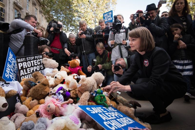 Δεκάδες Λονδρέζοι, μεταξύ των οποίων και η ηθοποιός Κάρεϊ Μάλιγκαν, άφησαν σήμερα εκατοντάδες αρκουδάκια, που συμβολίζουν τα παιδιά του Χαλεπιού, κοντά στην πρωθυπουργική κατοικία, στον αριθμό 10 της Ντάουνινγκ Στριτ, λίγες ώρες πριν λήξει η κατάπαυση του πυρός στην πολιορκημένη πόλη.