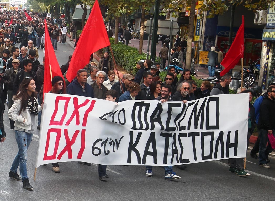 «Εμείς δεν κατεβαίνουμε σε διαδηλώσεις» λέει ο ένας πρωταγωνιστής του σκίτσου με τον δεύτερο να του απαντά «γι' αυτό κυβερνούν ακόμα αυτοί που κατέβαιναν»