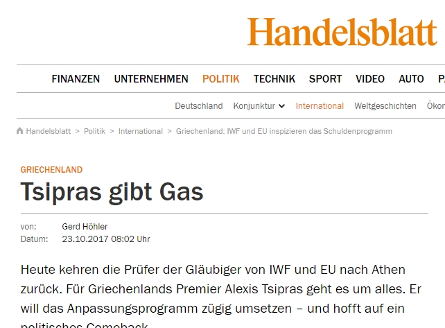 Σε ανταπόκριση από την Αθήνα, με τίτλο «Ο Τσίπρας πατάει γκάζι», η εφημερίδα Handelsblatt σημειώνει: «Σήμερα επιστρέφουν στην Αθήνα οι ελεγκτές του Διεθνούς Νομισματικού Ταμείου και της Ευρωπαϊκής Ένωσης. Ο Έλληνας πρωθυπουργός θέλει να εφαρμόσει το πρόγραμμα γρήγορα και ελπίζει σ΄ ένα πολιτικό come back».