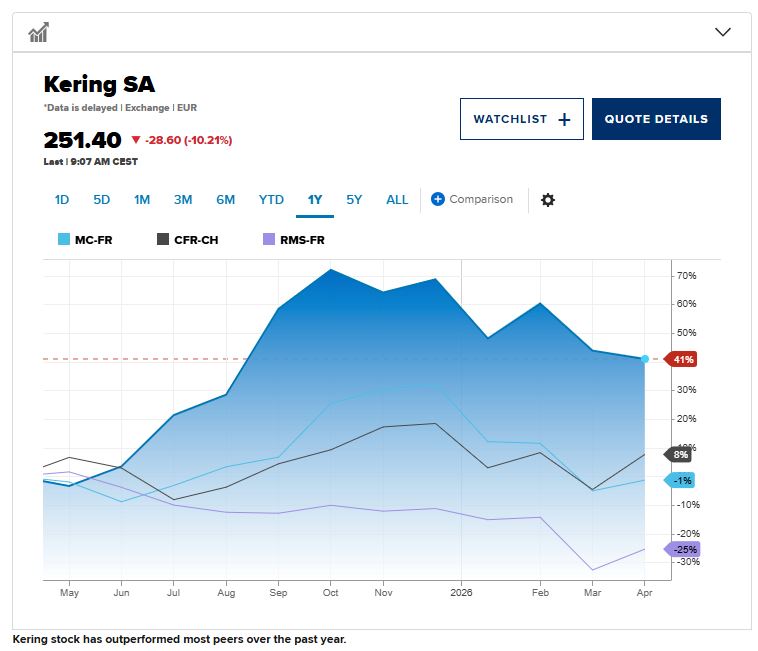 Η μετοχή της Kering, παρά τις πρόσφατες πιέσεις, έχει υπεραποδώσει έναντι ανταγωνιστών τον τελευταίο χρόνο και καταγράφει άνοδο περίπου 10% από την ανάληψη καθηκόντων του νέου CEO τον Σεπτέμβριο, καθώς οι επενδυτές εξακολουθούν να διατηρούν προσδοκίες για επιτυχή αναστροφή της πορείας του ομίλου.